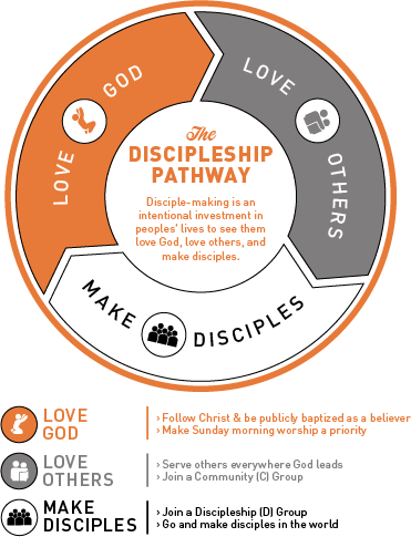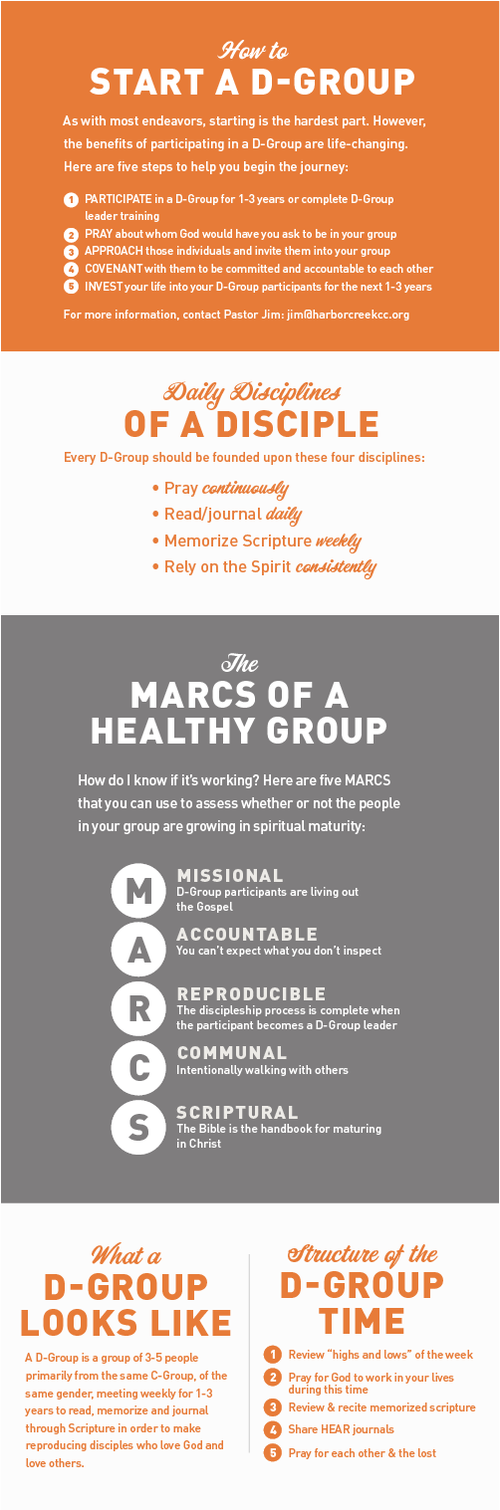 A Discipleship Group (D-Group) is a group of 3-5 people primarily from the same C-Group, of the same gender, meeting weekly for 1-3 years to read, memorize, and journal through Scripture in order to make reproducing disciples who love God and love others.